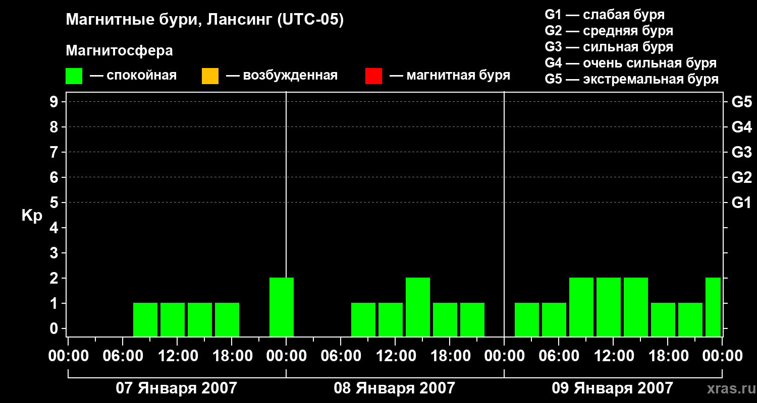 Изменения геомагнитного индекса Kp с 7 по 9 января 2007 года для средних широт