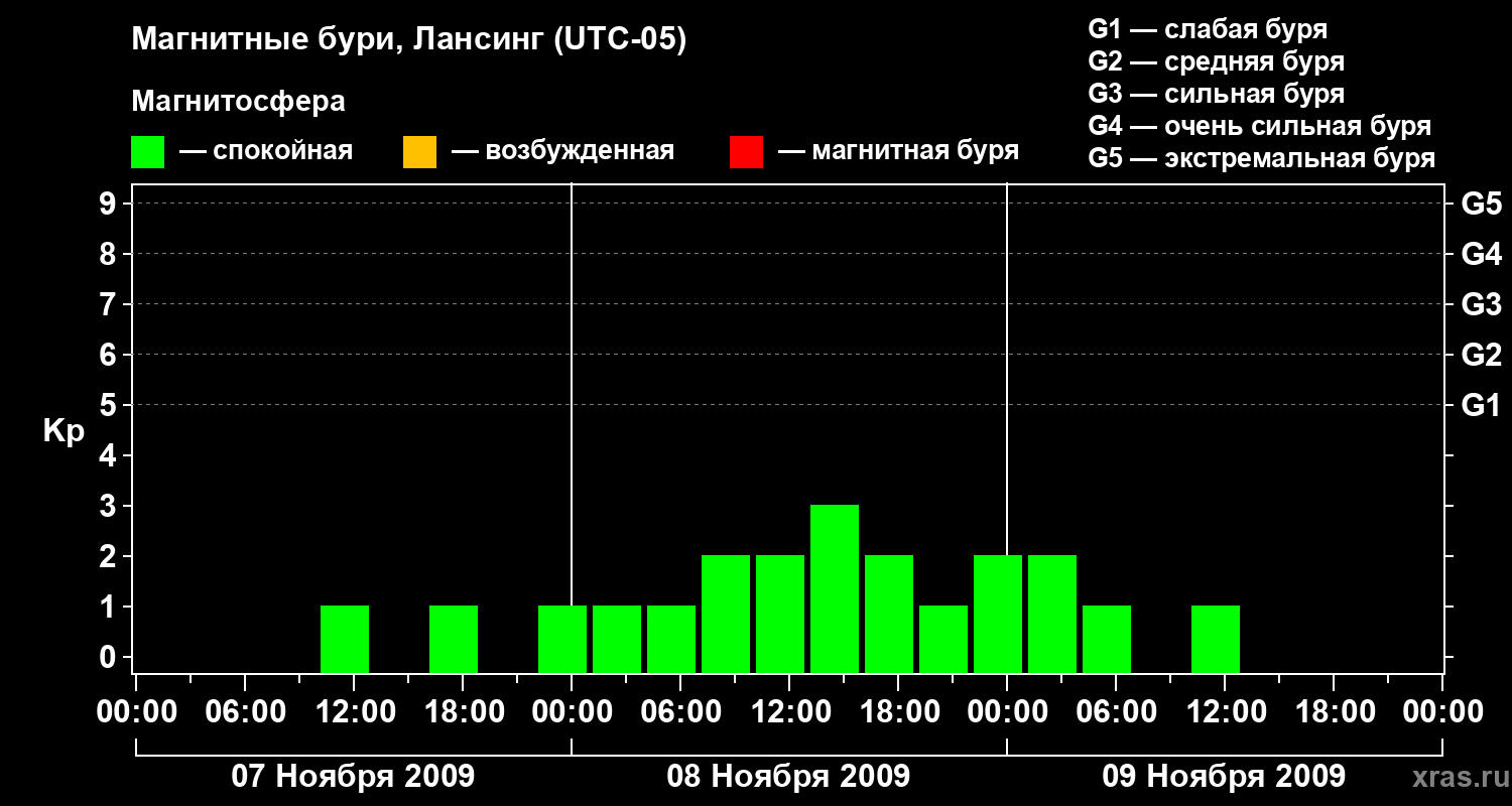 Изменения геомагнитного индекса Kp с 7 по 9 ноября 2009 года для средних широт