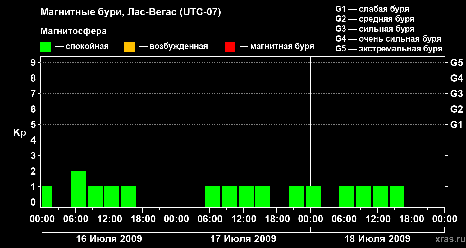 Изменения геомагнитного индекса Kp с 16 по 18 июля 2009 года для средних широт