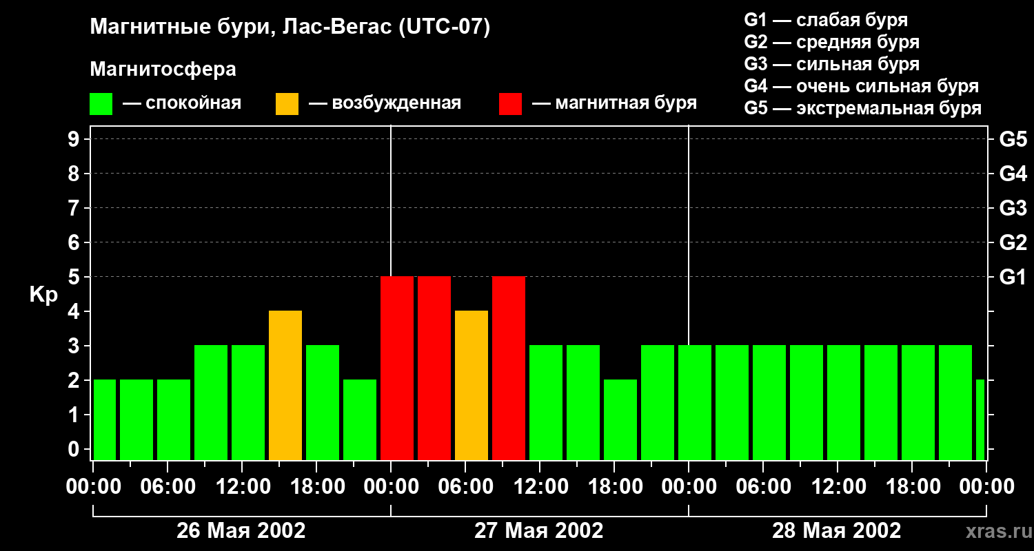 Изменения геомагнитного индекса Kp с 26 по 28 мая 2002 года для средних широт
