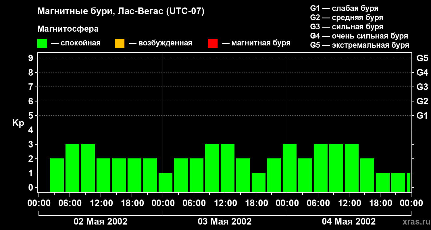 Изменения геомагнитного индекса Kp с 2 по 4 мая 2002 года для средних широт