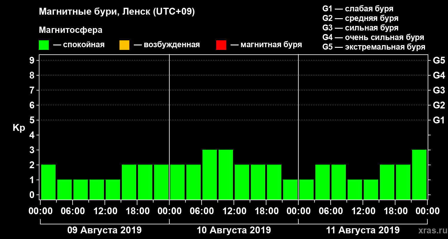 Изменения геомагнитного индекса Kp с 9 по 11 августа 2019 года для средних широт