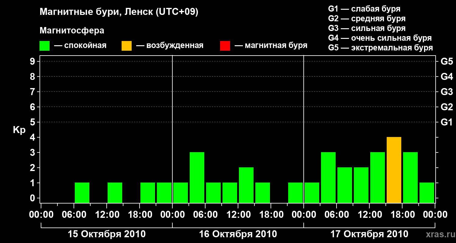 Изменения геомагнитного индекса Kp с 15 по 17 октября 2010 года для средних широт