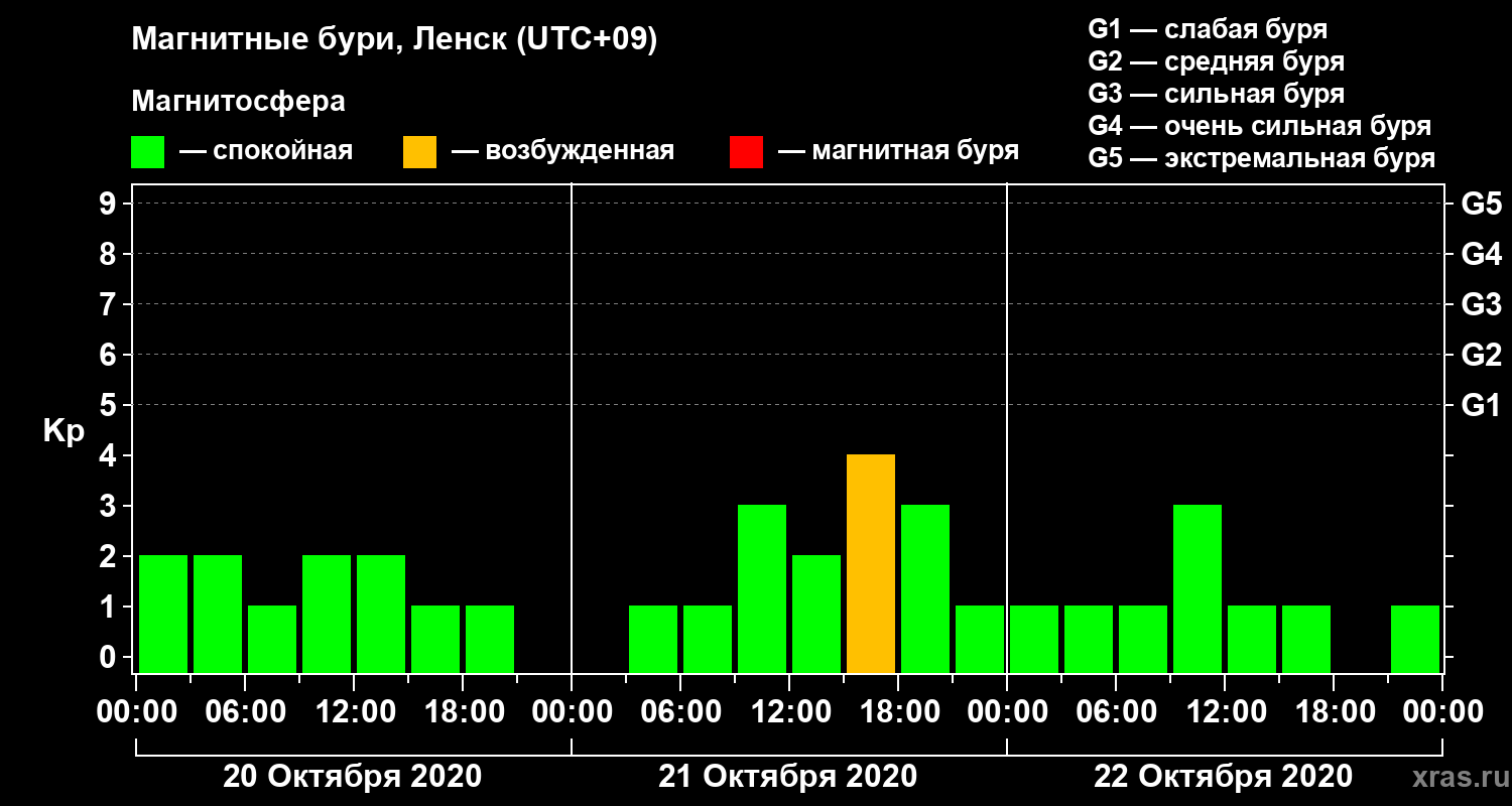 Изменения геомагнитного индекса Kp с 20 по 22 октября 2020 года для средних широт
