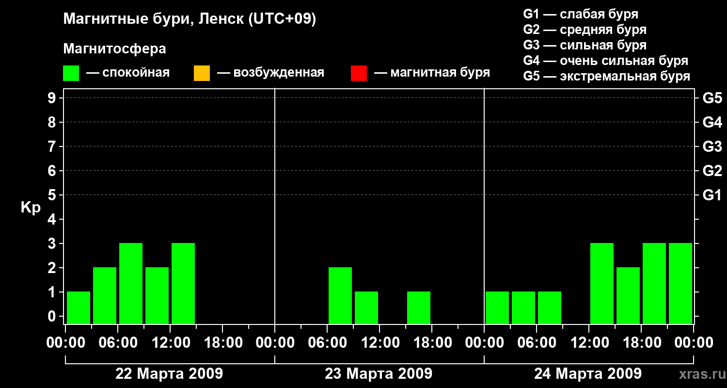 Изменения геомагнитного индекса Kp с 22 по 24 марта 2009 года для средних широт
