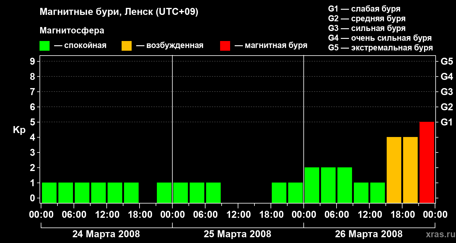 Изменения геомагнитного индекса Kp с 24 по 26 марта 2008 года для средних широт