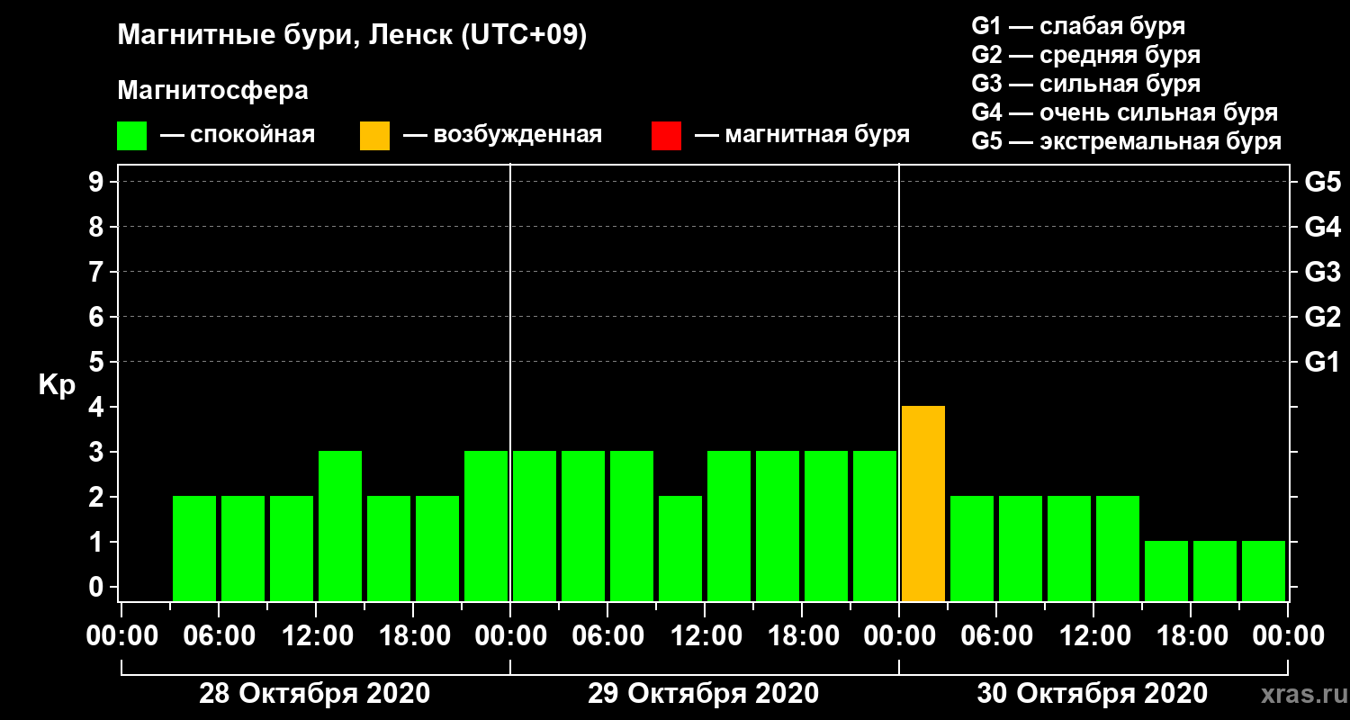 Изменения геомагнитного индекса Kp с 28 по 30 октября 2020 года для средних широт