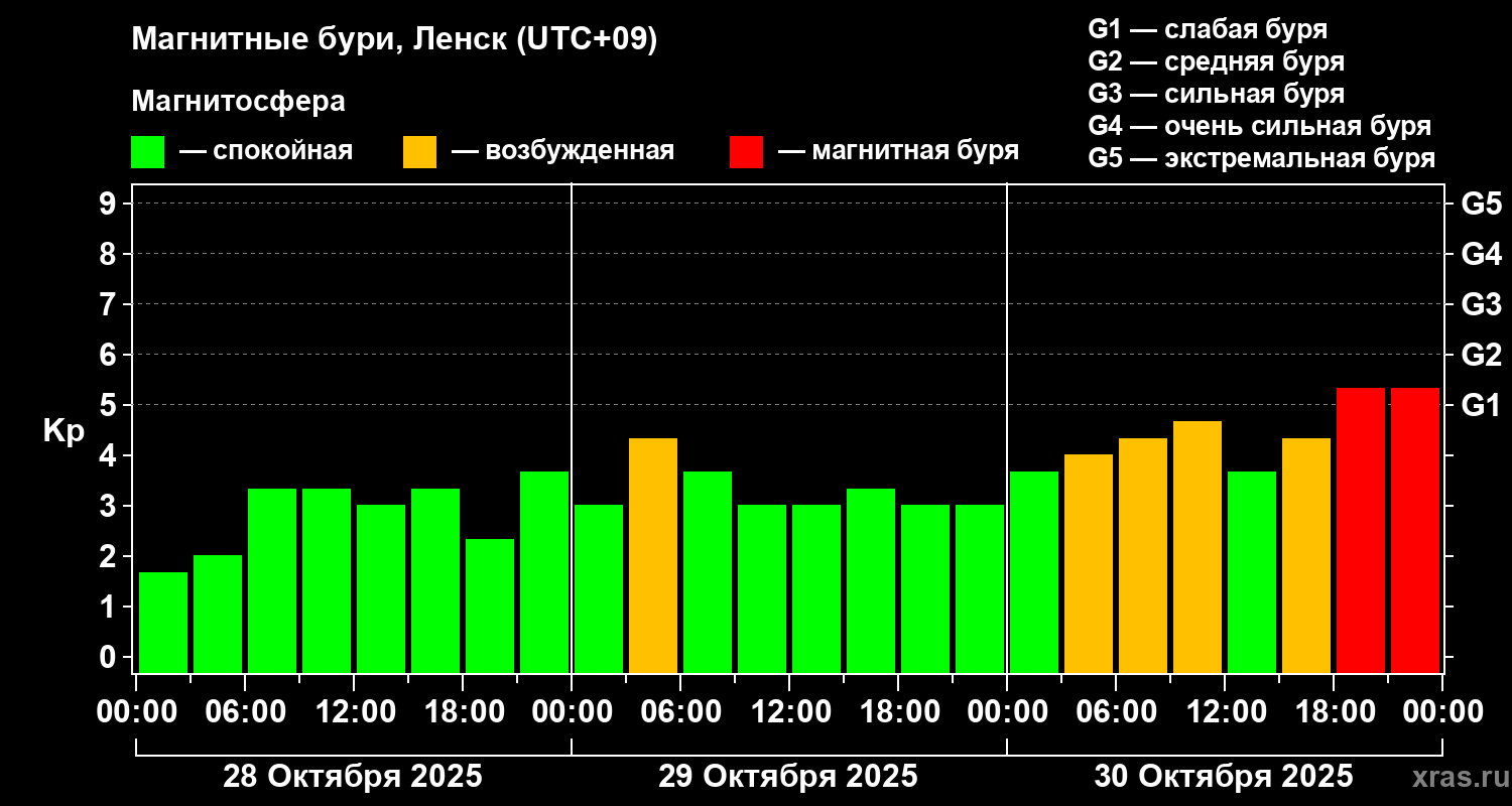 зарегистрирована магнитная буря уровня G1.3 (Kp = 5.33)