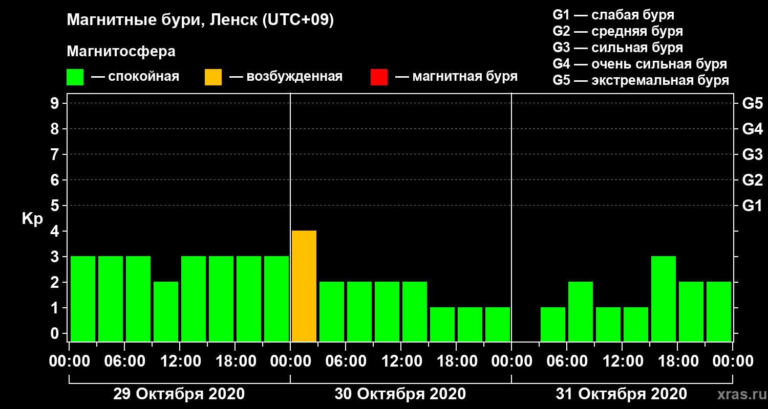 Изменения геомагнитного индекса Kp с 29 по 31 октября 2020 года для средних широт
