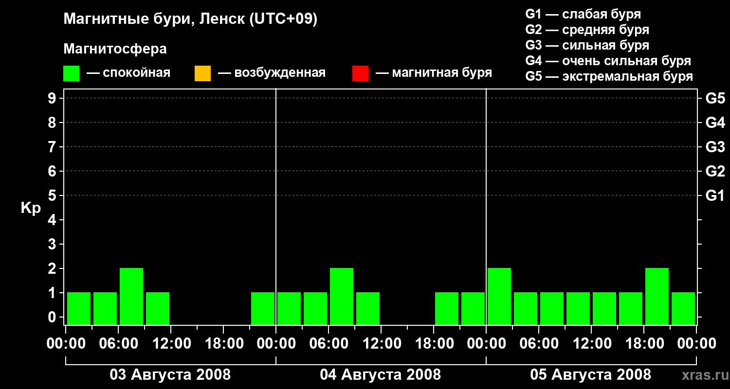 Изменения геомагнитного индекса Kp с 3 по 5 августа 2008 года для средних широт