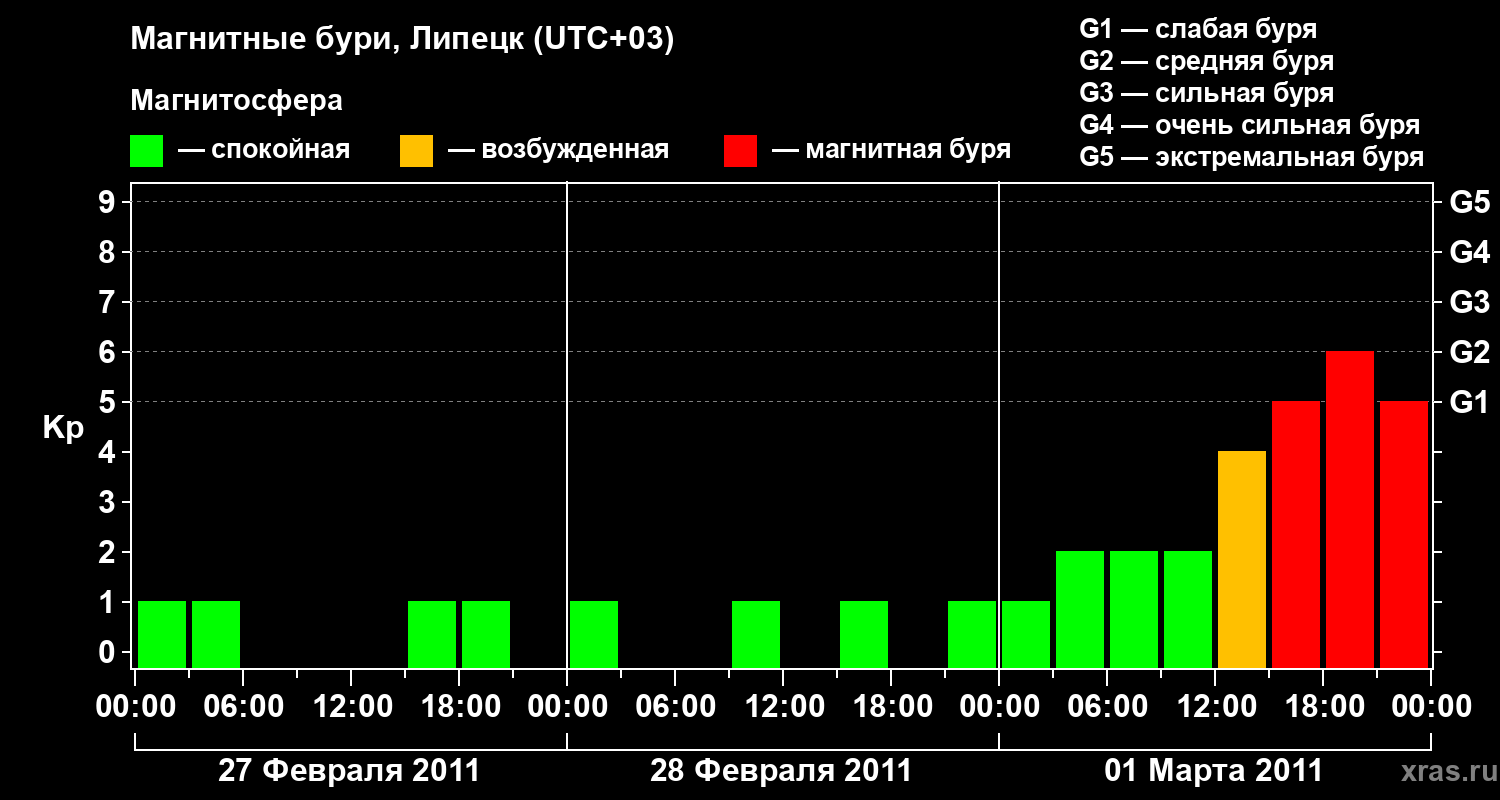 Изменения геомагнитного индекса Kp с 27 февраля по 1 марта 2011 года для средних широт