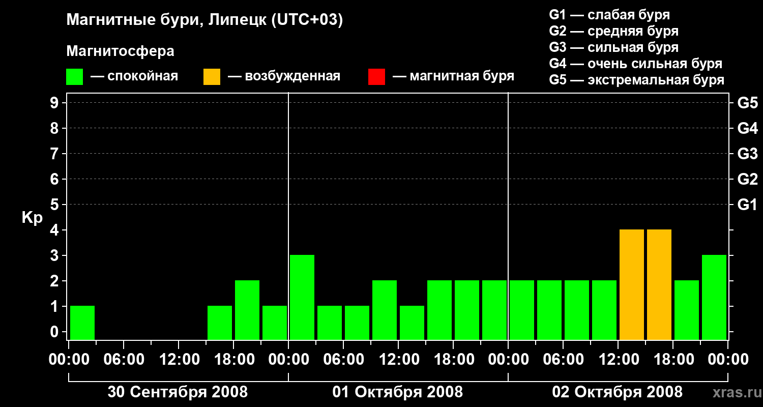 Изменения геомагнитного индекса Kp с 30 сентября по 2 октября 2008 года для средних широт