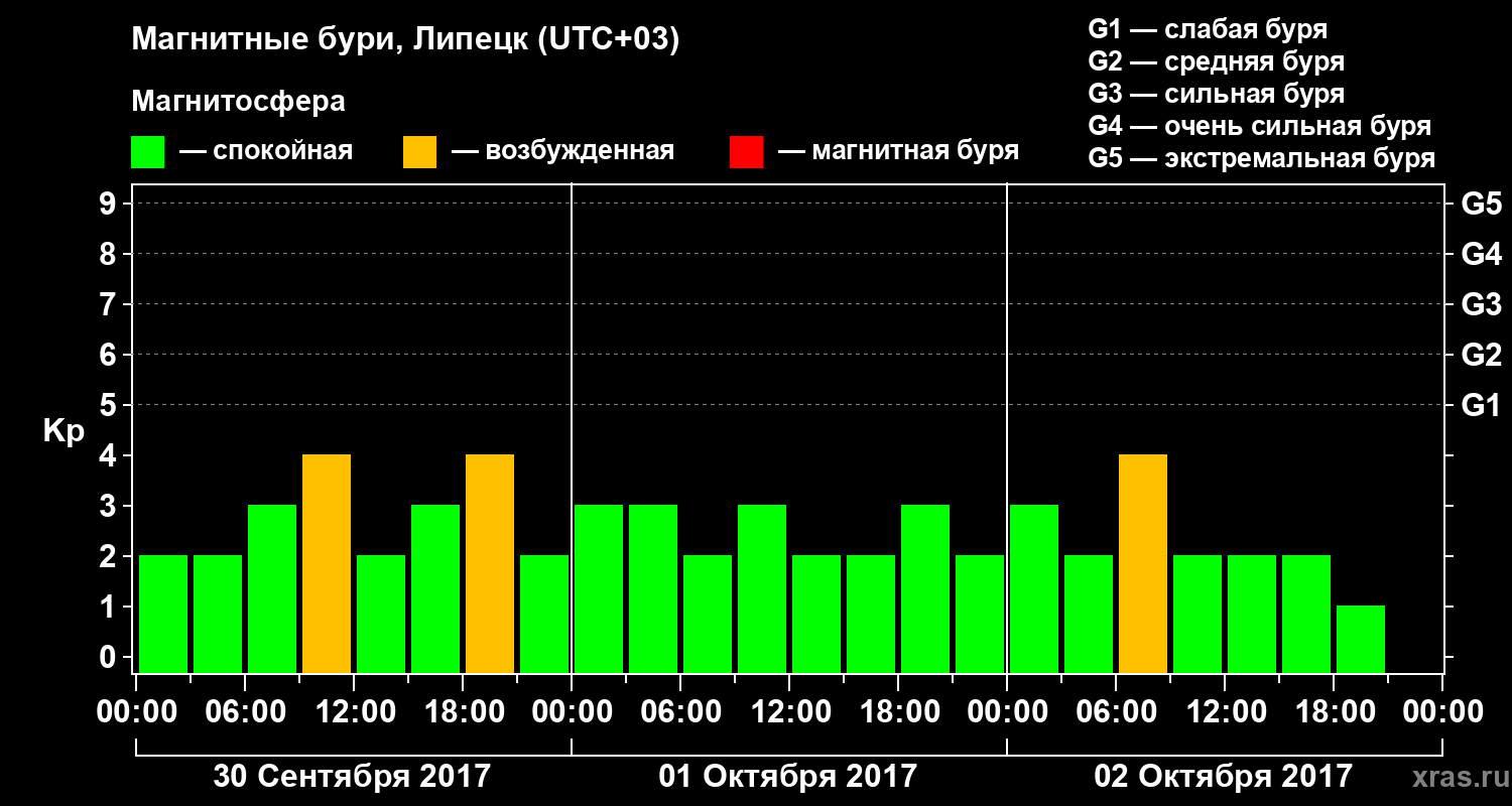 Изменения геомагнитного индекса Kp с 30 сентября по 2 октября 2017 года для средних широт