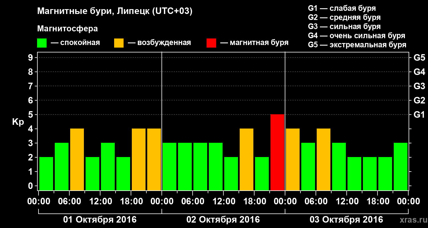 Изменения геомагнитного индекса Kp с 1 по 3 октября 2016 года для средних широт