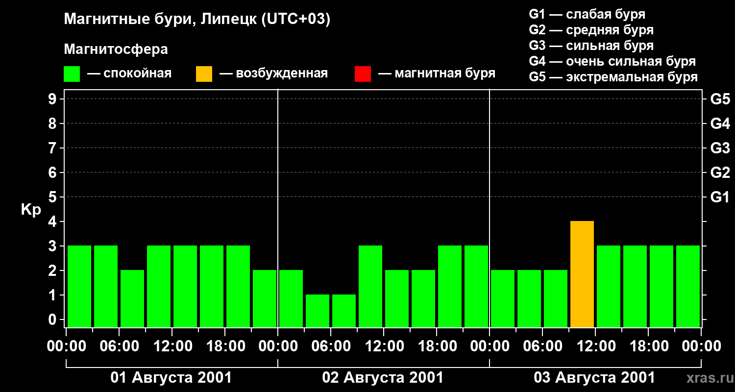 Изменения геомагнитного индекса Kp с 1 по 3 августа 2001 года для средних широт
