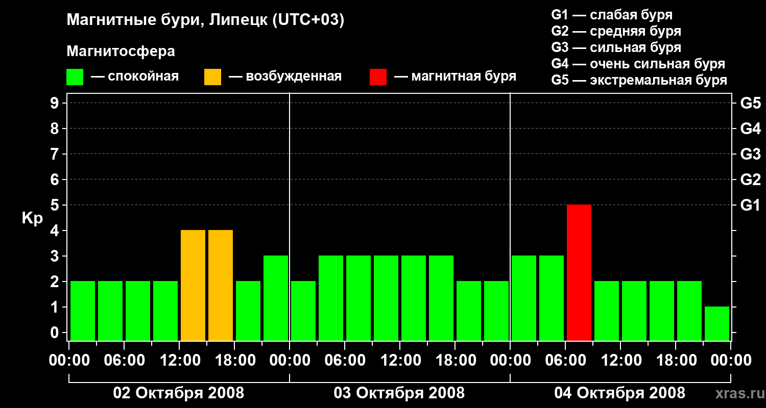Изменения геомагнитного индекса Kp с 2 по 4 октября 2008 года для средних широт