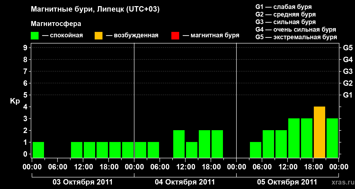 Изменения геомагнитного индекса Kp с 3 по 5 октября 2011 года для средних широт