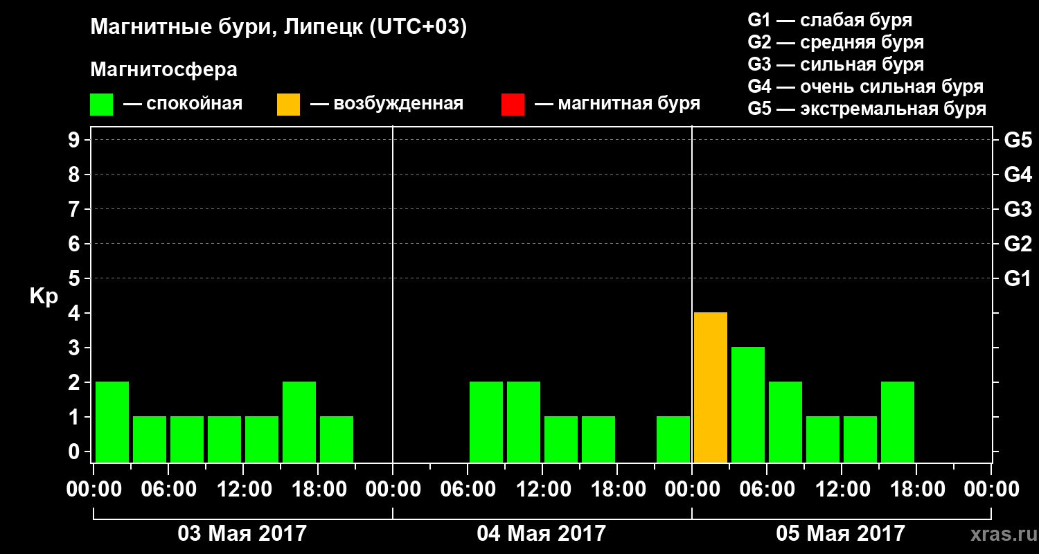 Изменения геомагнитного индекса Kp с 3 по 5 мая 2017 года для средних широт
