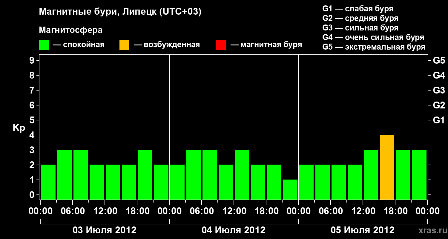 Изменения геомагнитного индекса Kp с 3 по 5 июля 2012 года для средних широт