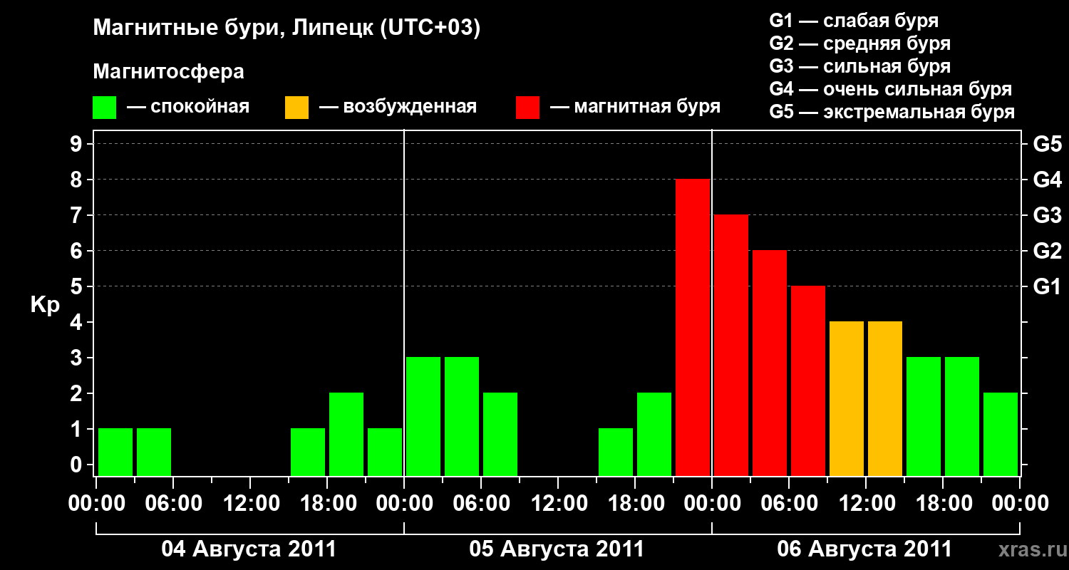 Изменения геомагнитного индекса Kp с 4 по 6 августа 2011 года для средних широт