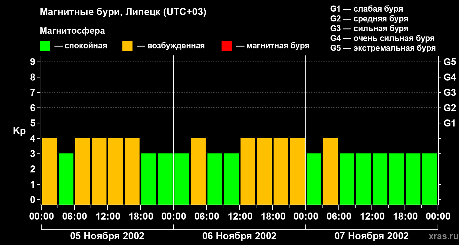 Изменения геомагнитного индекса Kp с 5 по 7 ноября 2002 года для средних широт