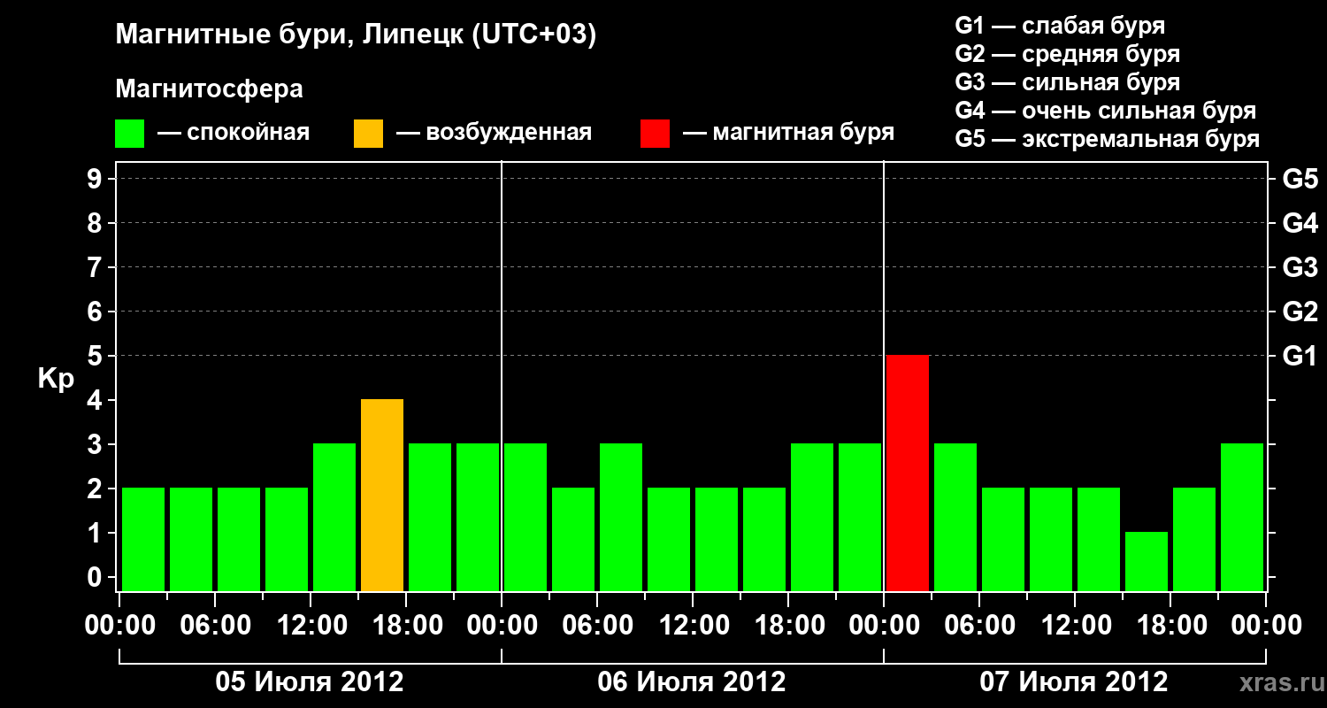 Изменения геомагнитного индекса Kp с 5 по 7 июля 2012 года для средних широт