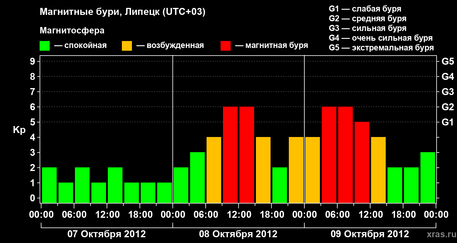 Изменения геомагнитного индекса Kp с 7 по 9 октября 2012 года для средних широт