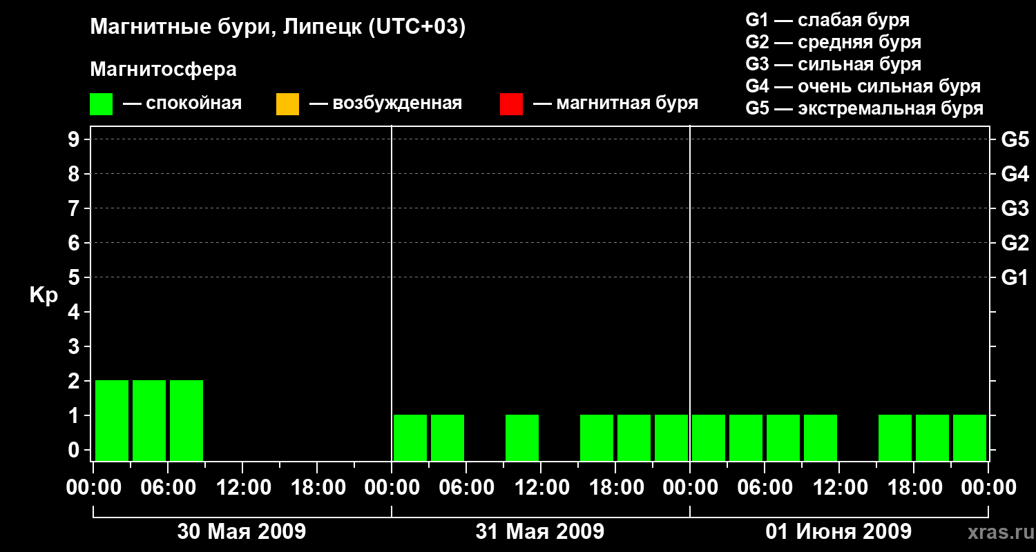 Изменения геомагнитного индекса Kp с 30 мая по 1 июня 2009 года для средних широт