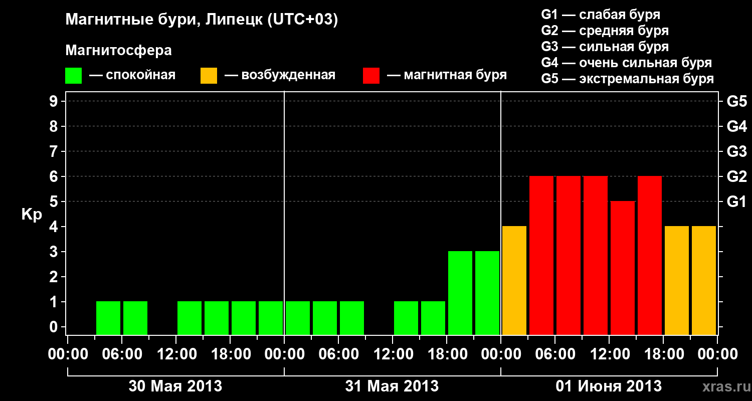 Изменения геомагнитного индекса Kp с 30 мая по 1 июня 2013 года для средних широт