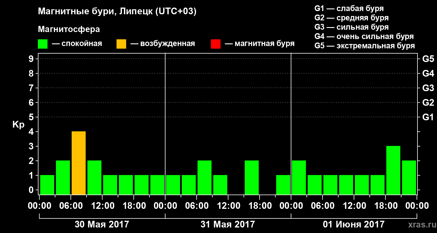 Изменения геомагнитного индекса Kp с 30 мая по 1 июня 2017 года для средних широт
