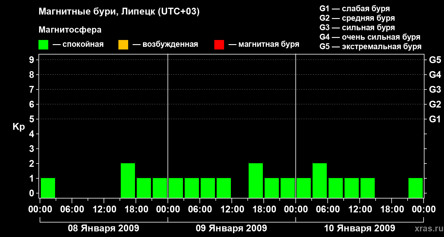 Изменения геомагнитного индекса Kp с 8 по 10 января 2009 года для средних широт