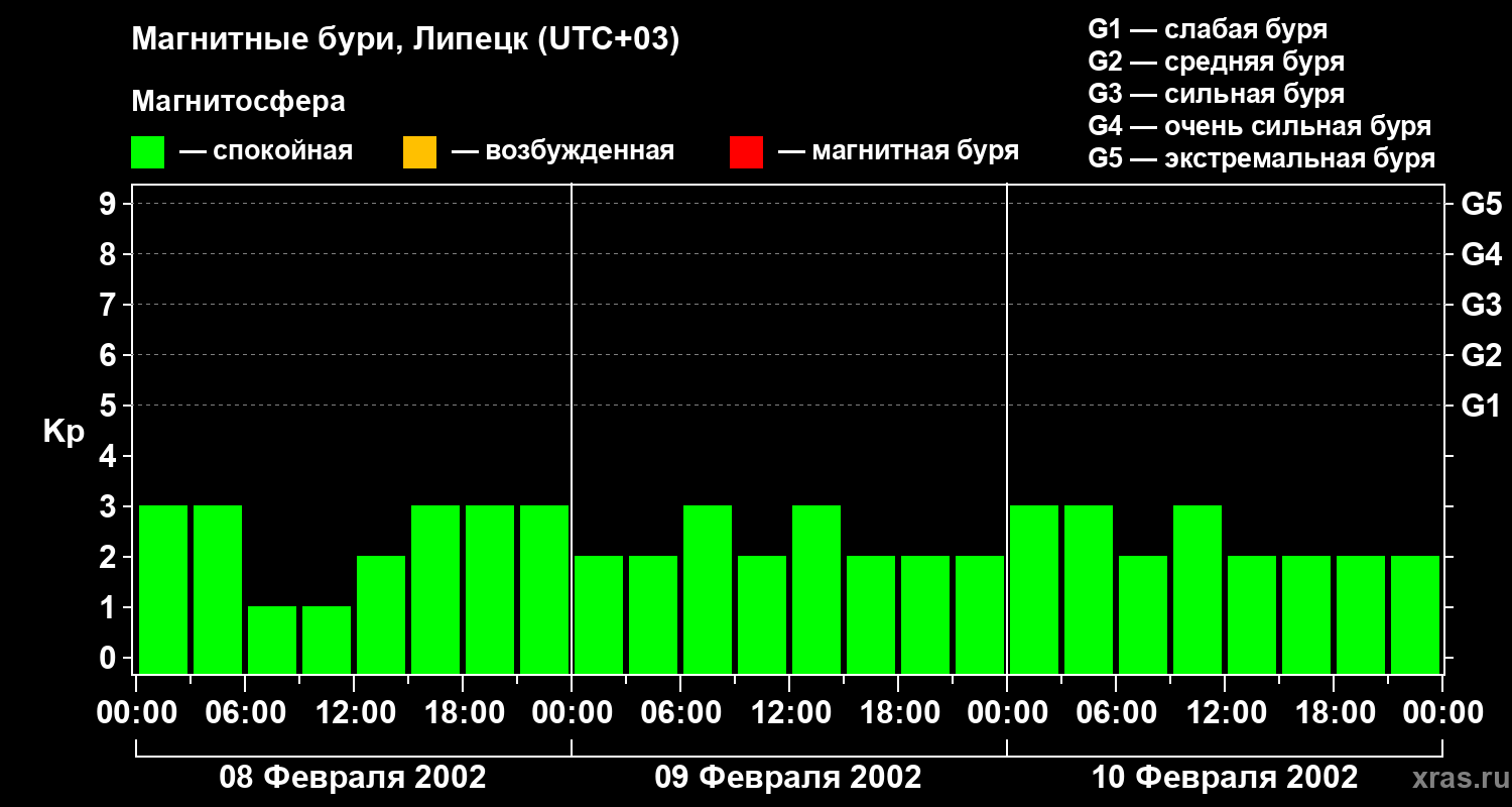 Изменения геомагнитного индекса Kp с 8 по 10 февраля 2002 года для средних широт