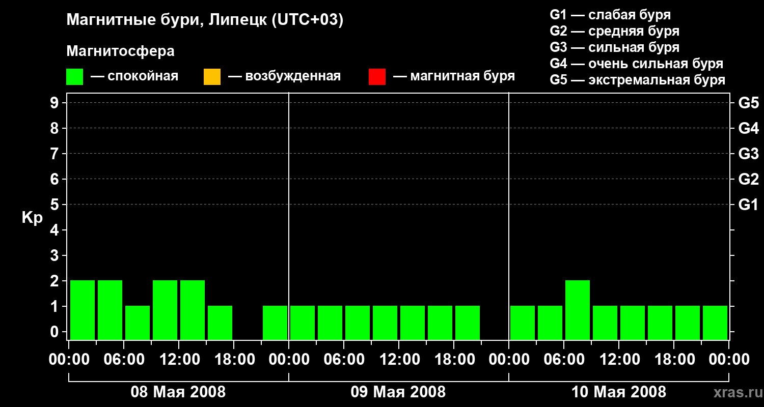 Изменения геомагнитного индекса Kp с 8 по 10 мая 2008 года для средних широт