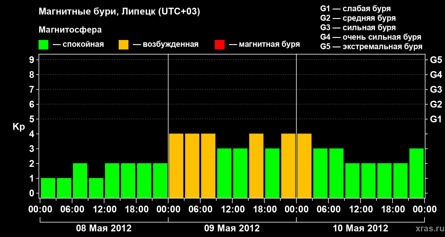 Изменения геомагнитного индекса Kp с 8 по 10 мая 2012 года для средних широт