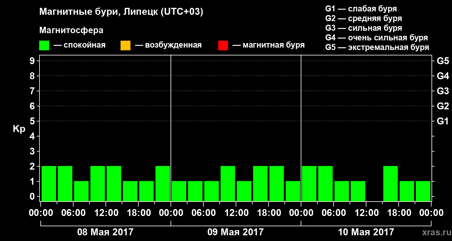 Изменения геомагнитного индекса Kp с 8 по 10 мая 2017 года для средних широт