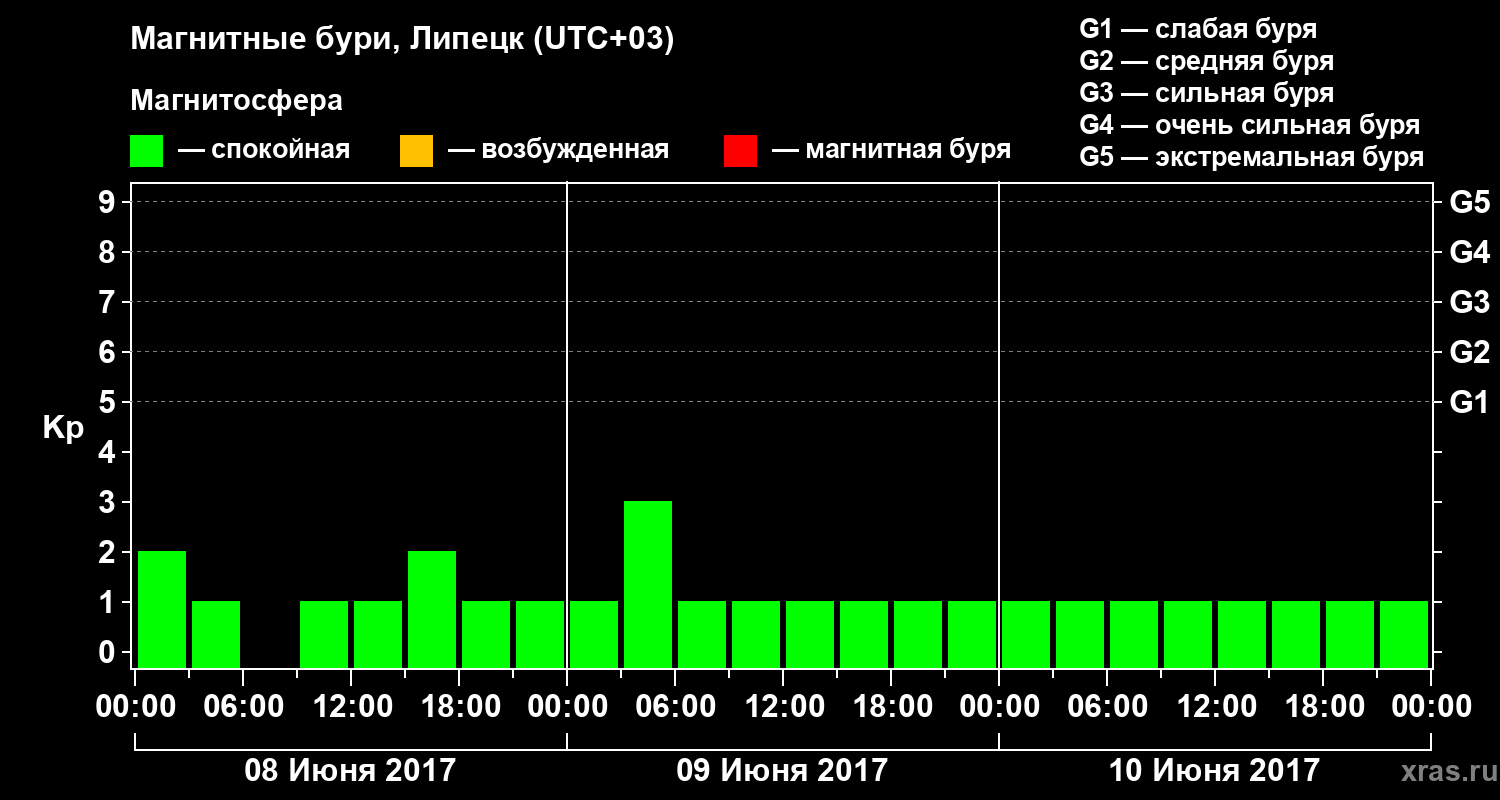 Изменения геомагнитного индекса Kp с 8 по 10 июня 2017 года для средних широт