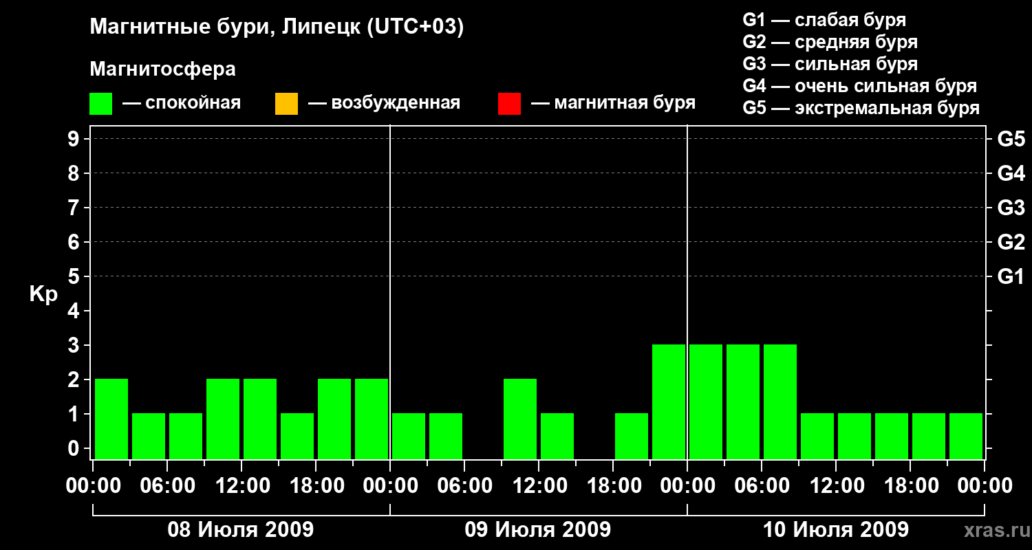 Изменения геомагнитного индекса Kp с 8 по 10 июля 2009 года для средних широт