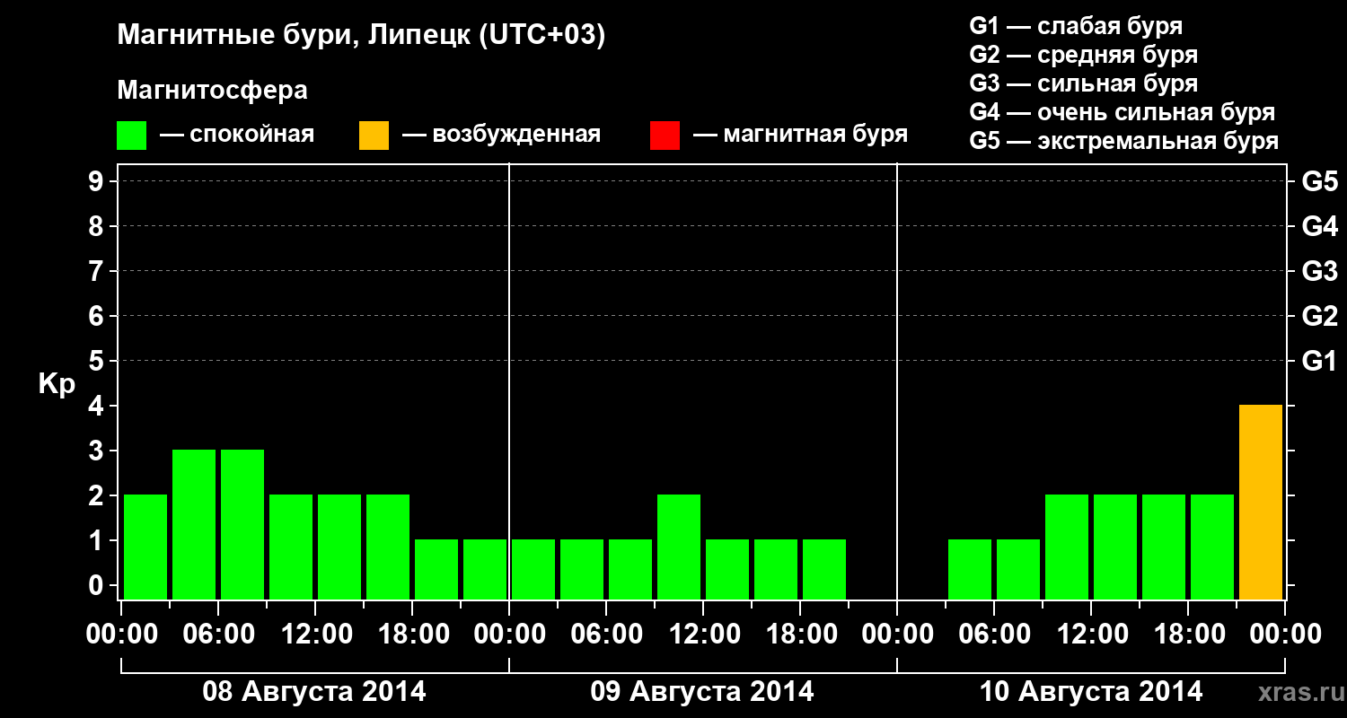 Изменения геомагнитного индекса Kp с 8 по 10 августа 2014 года для средних широт