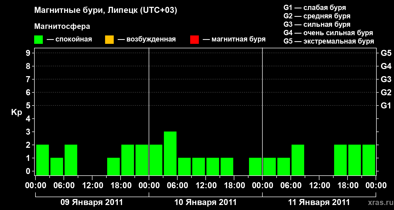 Изменения геомагнитного индекса Kp с 9 по 11 января 2011 года для средних широт