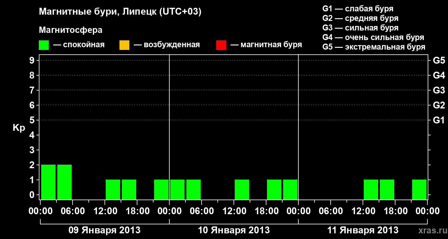 Изменения геомагнитного индекса Kp с 9 по 11 января 2013 года для средних широт