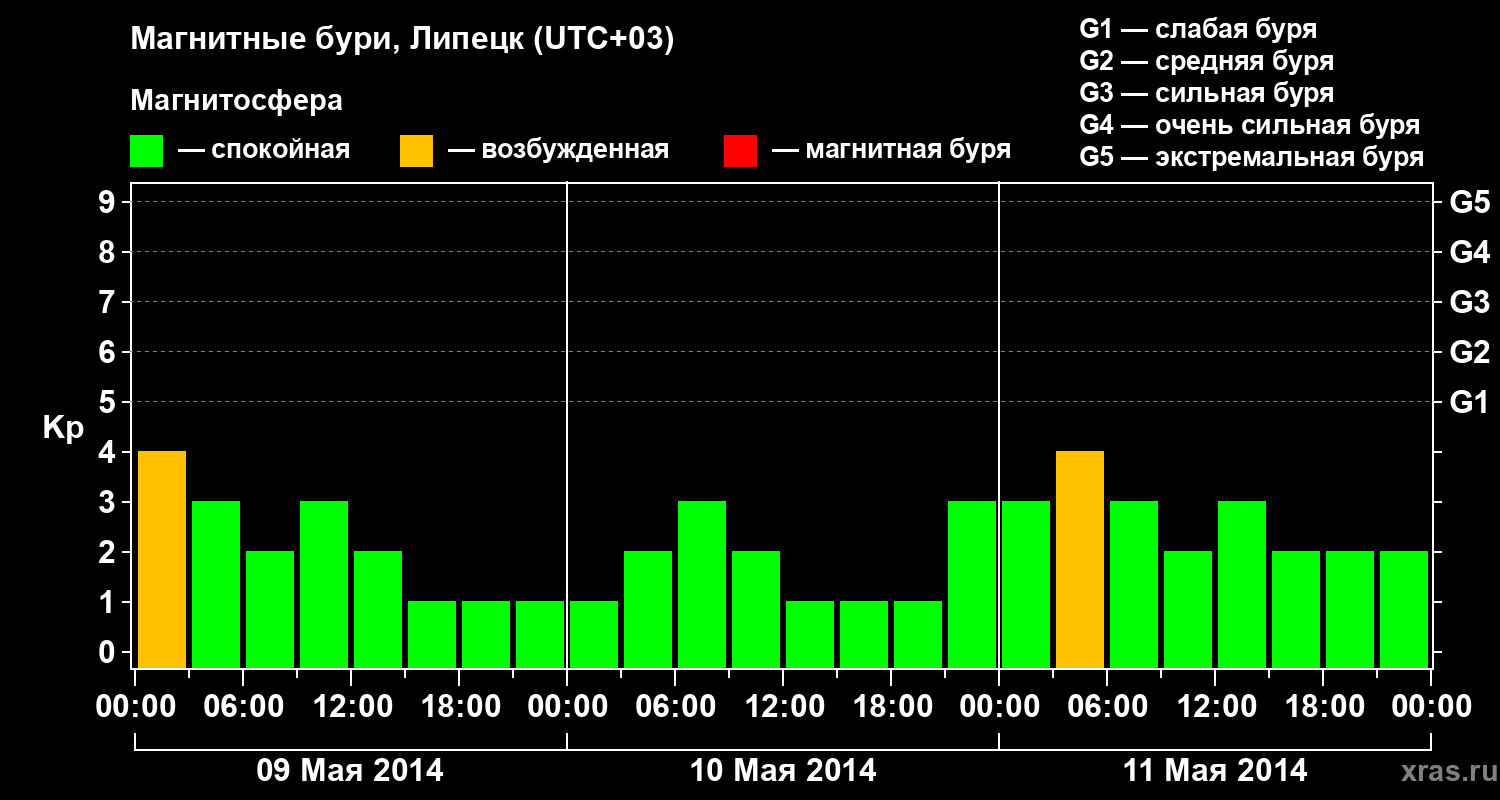 Изменения геомагнитного индекса Kp с 9 по 11 мая 2014 года для средних широт