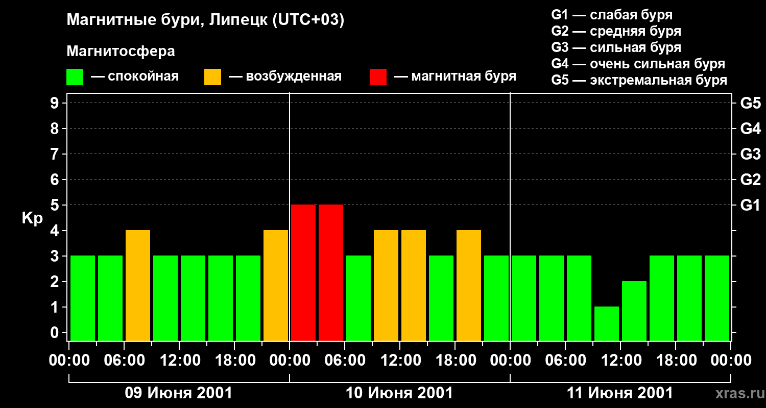 Изменения геомагнитного индекса Kp с 9 по 11 июня 2001 года для средних широт