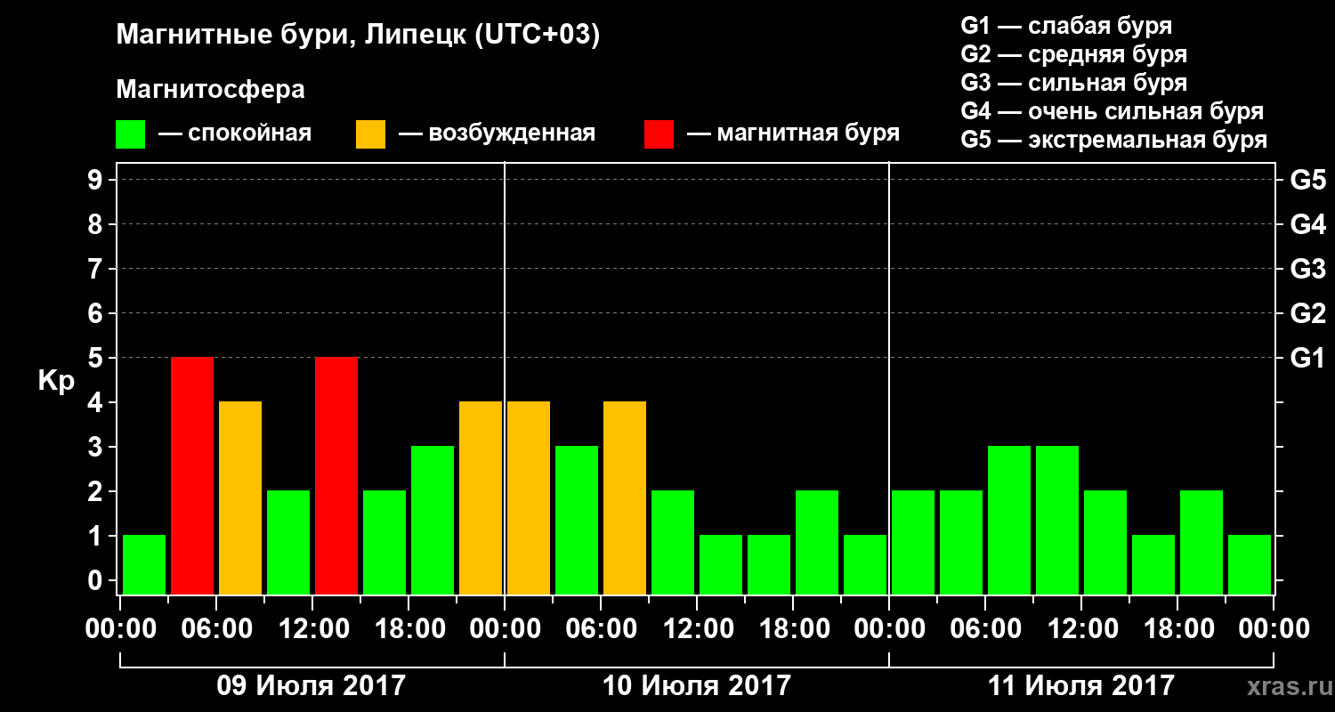 Изменения геомагнитного индекса Kp с 9 по 11 июля 2017 года для средних широт