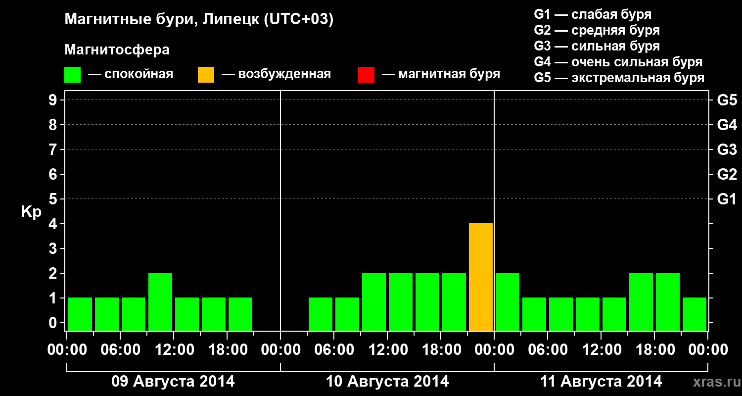 Изменения геомагнитного индекса Kp с 9 по 11 августа 2014 года для средних широт