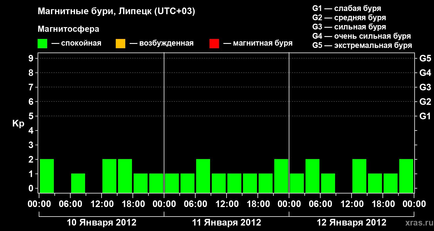 Изменения геомагнитного индекса Kp с 10 по 12 января 2012 года для средних широт