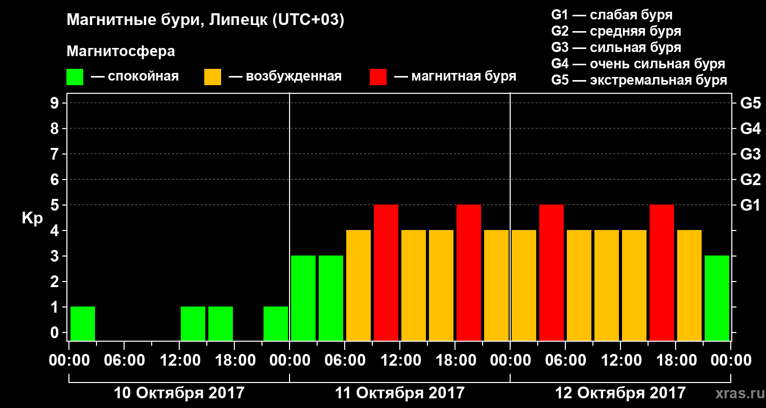 Изменения геомагнитного индекса Kp с 10 по 12 октября 2017 года для средних широт