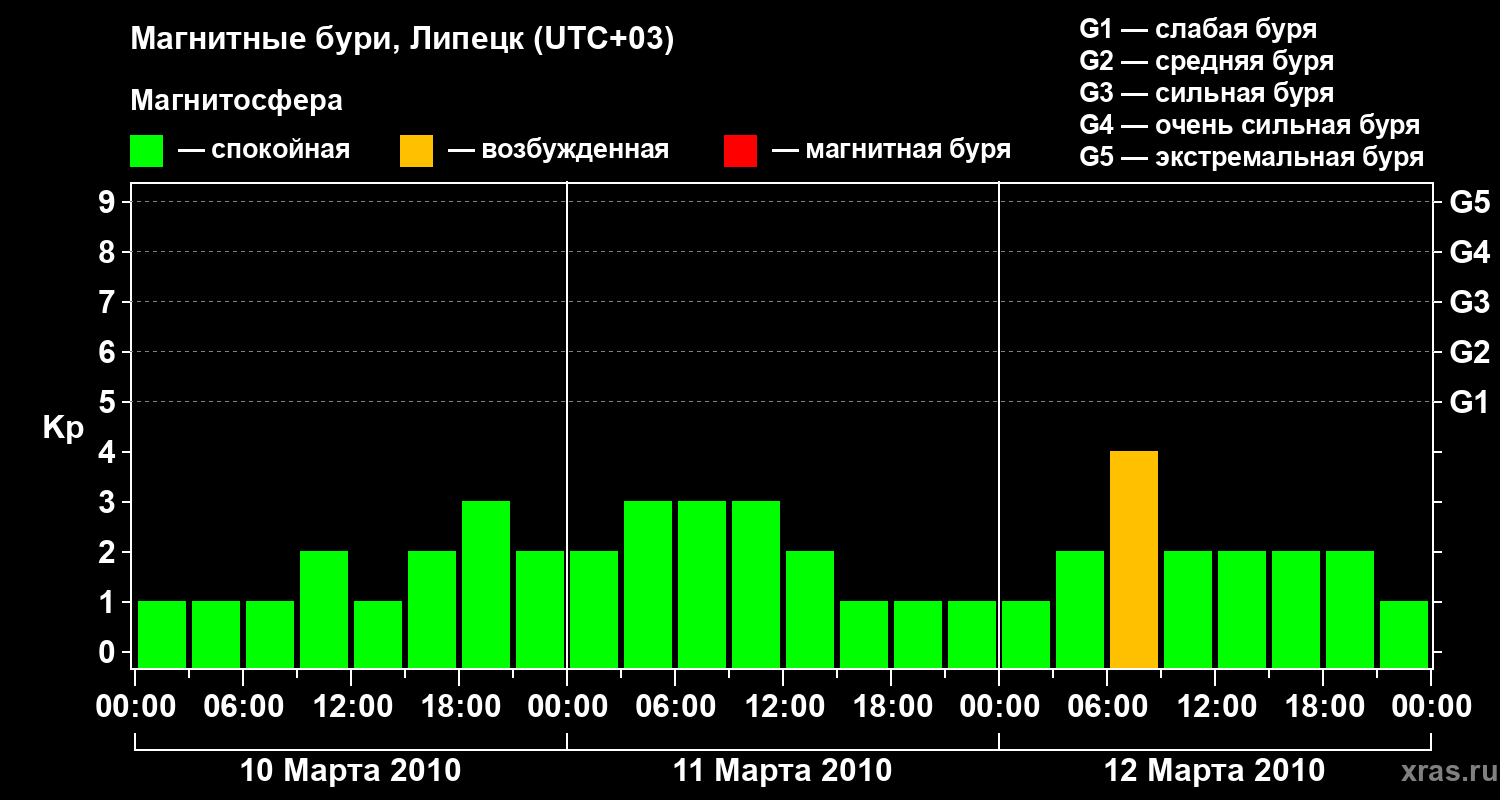 Изменения геомагнитного индекса Kp с 10 по 12 марта 2010 года для средних широт