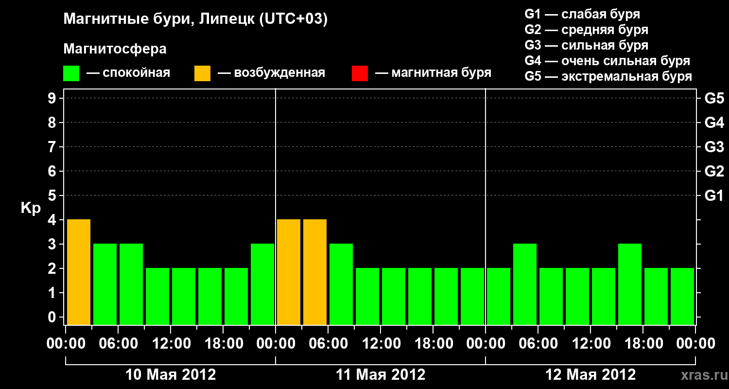 Изменения геомагнитного индекса Kp с 10 по 12 мая 2012 года для средних широт