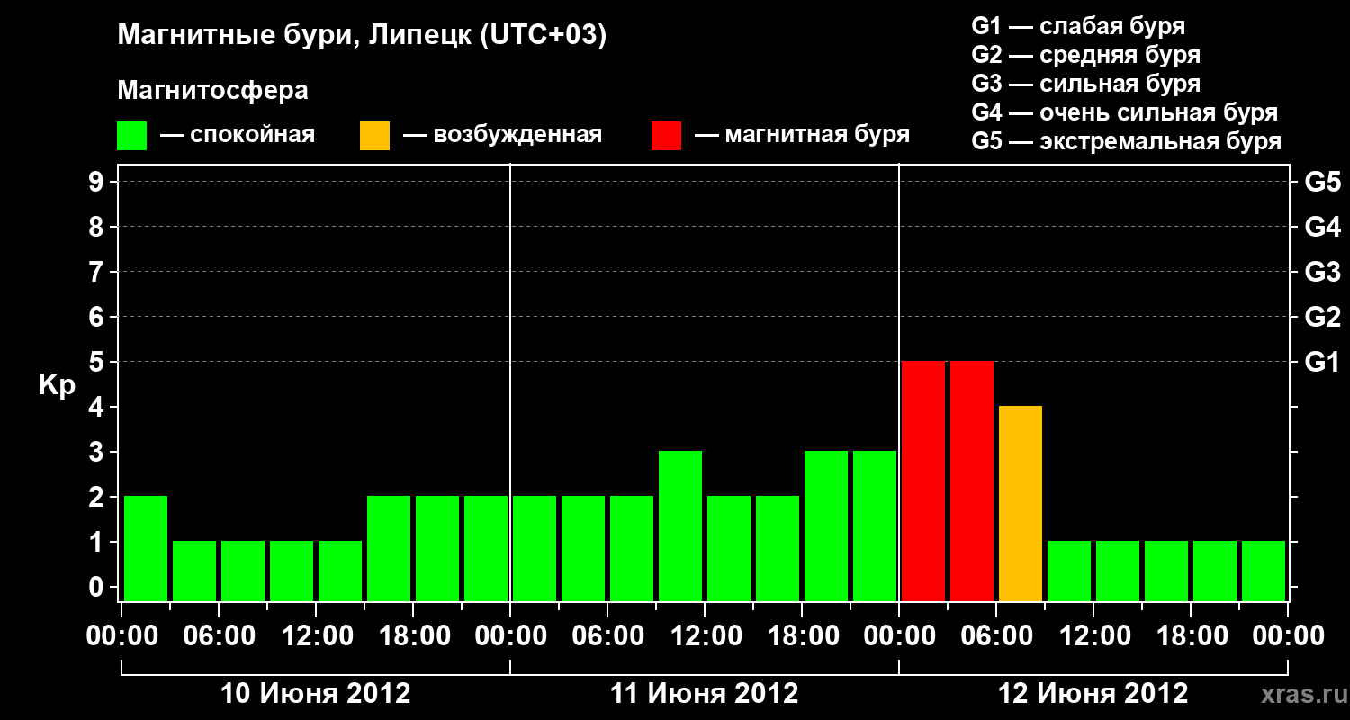 Изменения геомагнитного индекса Kp с 10 по 12 июня 2012 года для средних широт