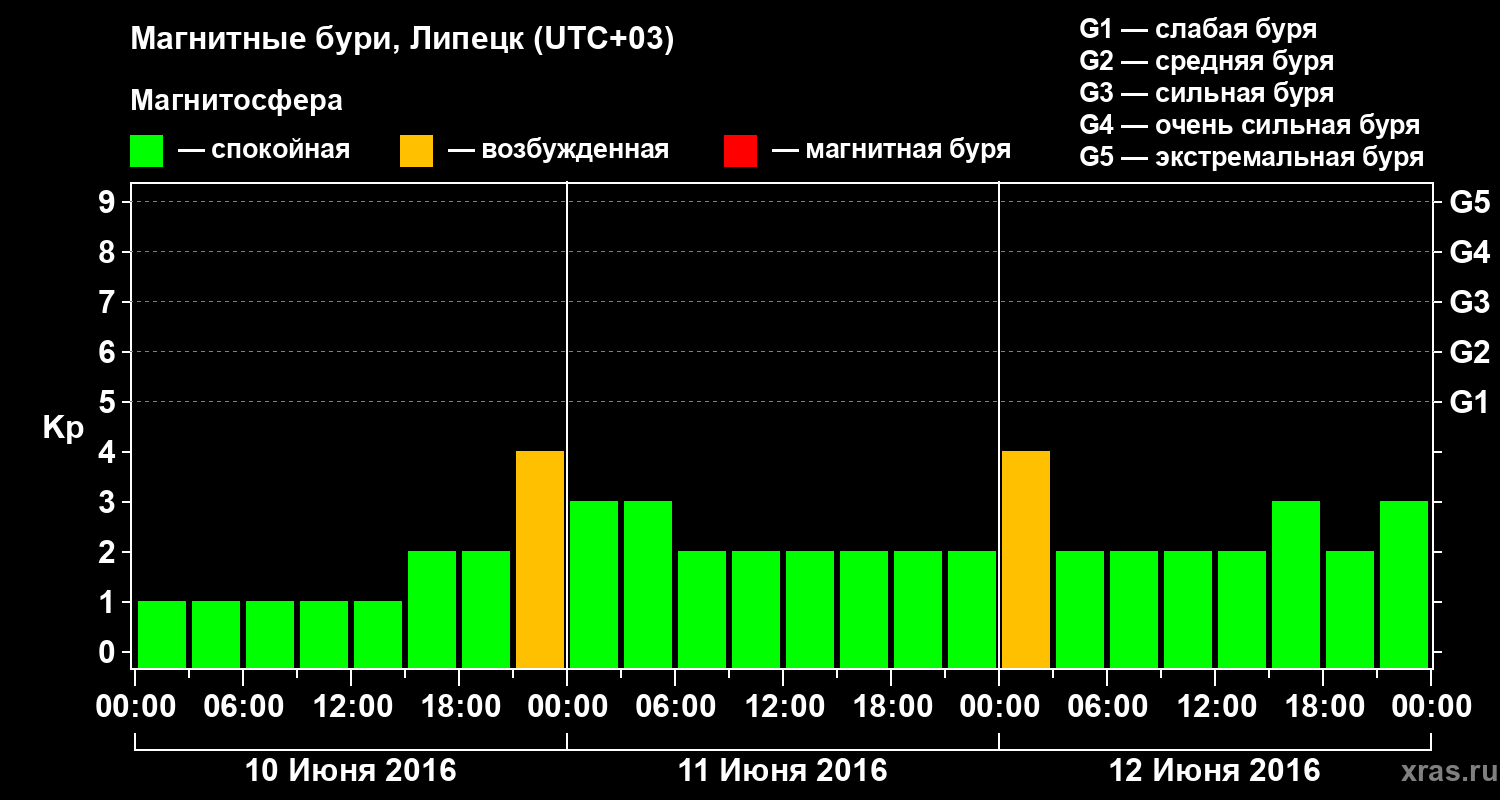 Изменения геомагнитного индекса Kp с 10 по 12 июня 2016 года для средних широт